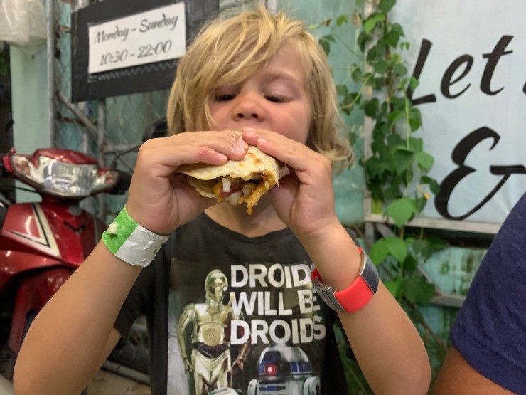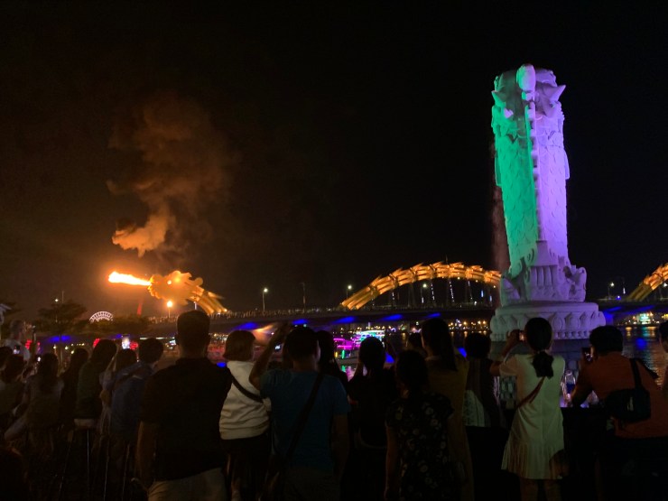 Plutôt échaudés de notre soirée précédente, nous sommes retournés aux délicieux tacos (parmi nos meilleurs à vie!) et au Dragon Bridge. Le spectacle de lumières ayant lieu les samedis et dimanches, nous avons pu admirer le dragon cracher eau et feu.