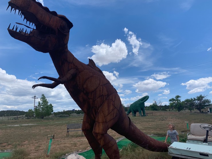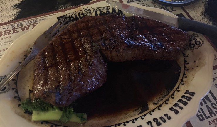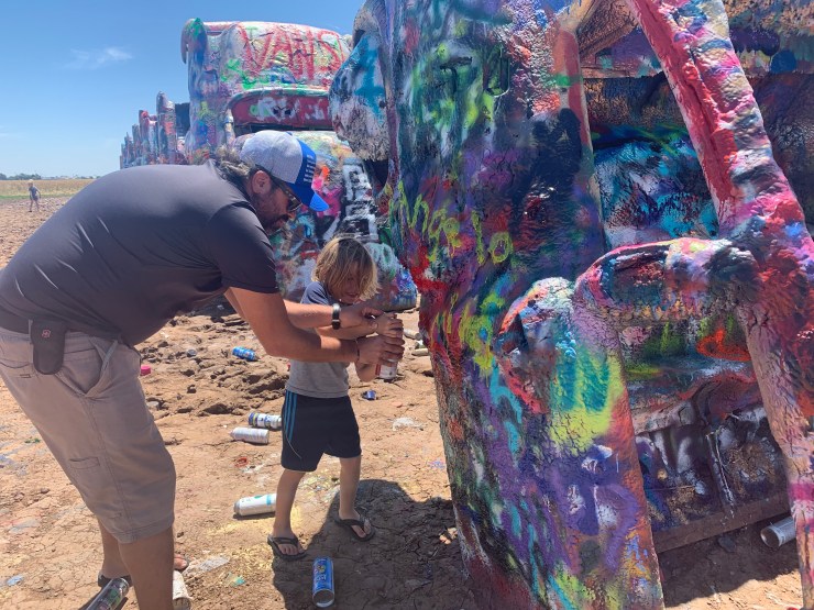 *Amarillo : LĂ©on aura contribuĂ© Ă colorer le Cadillac Ranch avec une vielle canette trouvĂ©e sur place… Puis, lunch au mythique resto Big Texan Steak Ranch. Notre 1er steak en prĂšs de 7 mois. Nous n’avons pas osĂ© le 72 oz, mais nous avons partagĂ© bon morceau tous les 4 avec quelques sides.