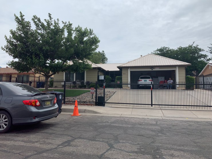 *Albuqerque : la maison de Walter dans Breaking Bad (seule maison clĂŽturĂ©e sur la rue et c’est bien indiquĂ© de prendre nos photos de l’autre cĂŽtĂ©… nous aurons eu droit Ă un beau sourire du proprio)