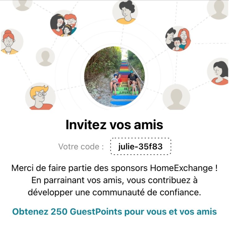 Voici notre code de parrainage. Nous recevrons 250 guest points si vous utilisez notre code (et vous aussi!).